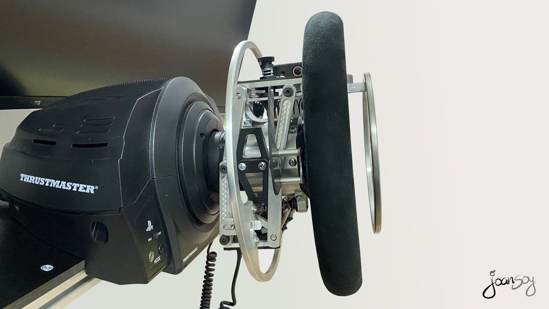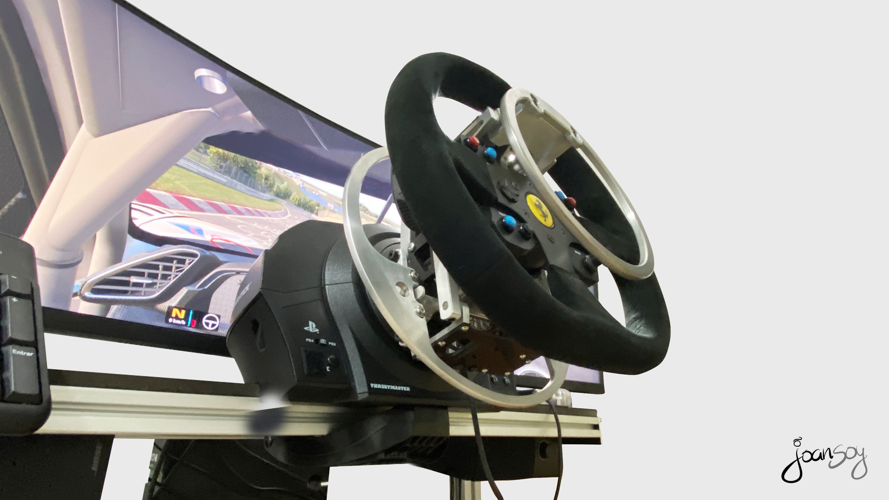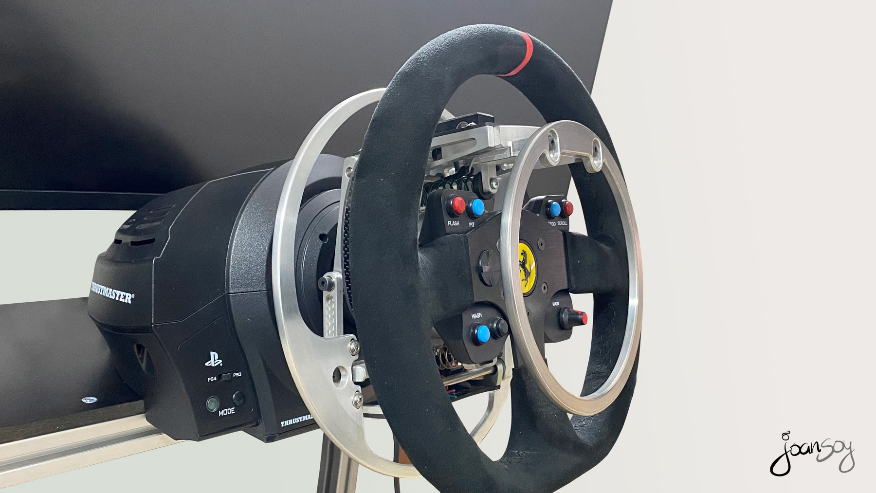 Gracias a la fabulosa adaptación del volante de Glenn Sidman www.simability.com y un soporte especial hecho a medida con la integración de la pantalla y el volante en la misma estructura www.zalem.es me hacen volver a disfrutar de lo lindo con el mundo del Simracing!!! 😀